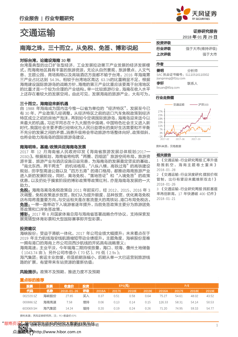 天风证券*行业研究*南海之珠,三十而立,从免税、免签、博彩说起--交通运输行业报告行业专题研究 1 交通运输证券研究报告2018年01月29日投资评级行业评级强于大市(维持评级) 上次评级强于大市作者 姜明分析师SAC执业证书编号:S02 李轩联系人 资料来源:贝格数据 相关报告1 《交通运输-行业研究周报:汇率升值助推航空,海南主题卷土重来》 2018-01-28 2 《交通运输-行业深度研究:摆脱价格管制,出行有望迎来戴维斯双击!》 2018-01-26 3 《交通运输-行业研究周报:民航客座率再创新高,17年快递破400亿件》 2018-01-21 行业走势图南海之珠,三十而立,从免税、免签、博彩说起对标台湾,论建设海南30年台湾是典型的出口扩张型经济,工业发展拉动第三产业发展的经济发展模式。